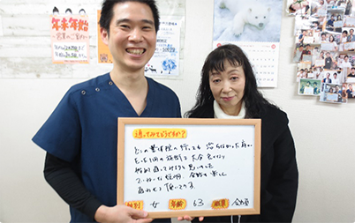 どの整体に行っても治らなかった肩の痛みがたった1回の施術で大分良くなり始めて通ってみようと思いました。ていねいな説明、会話も楽しく通わせて頂いてます。