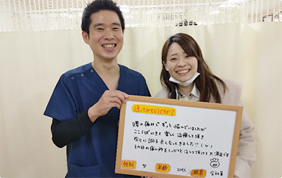 腰の痛みでずっと悩んでいましたが、ここにきて楽しく治療して頂き徐々に調子良くなってきました!!