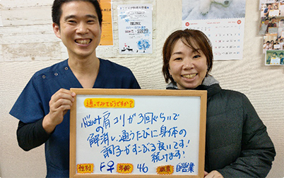 悩みの肩コリが3回くらいで解消し、通うたびに身体の調子がすこぶる良いです!続けます!